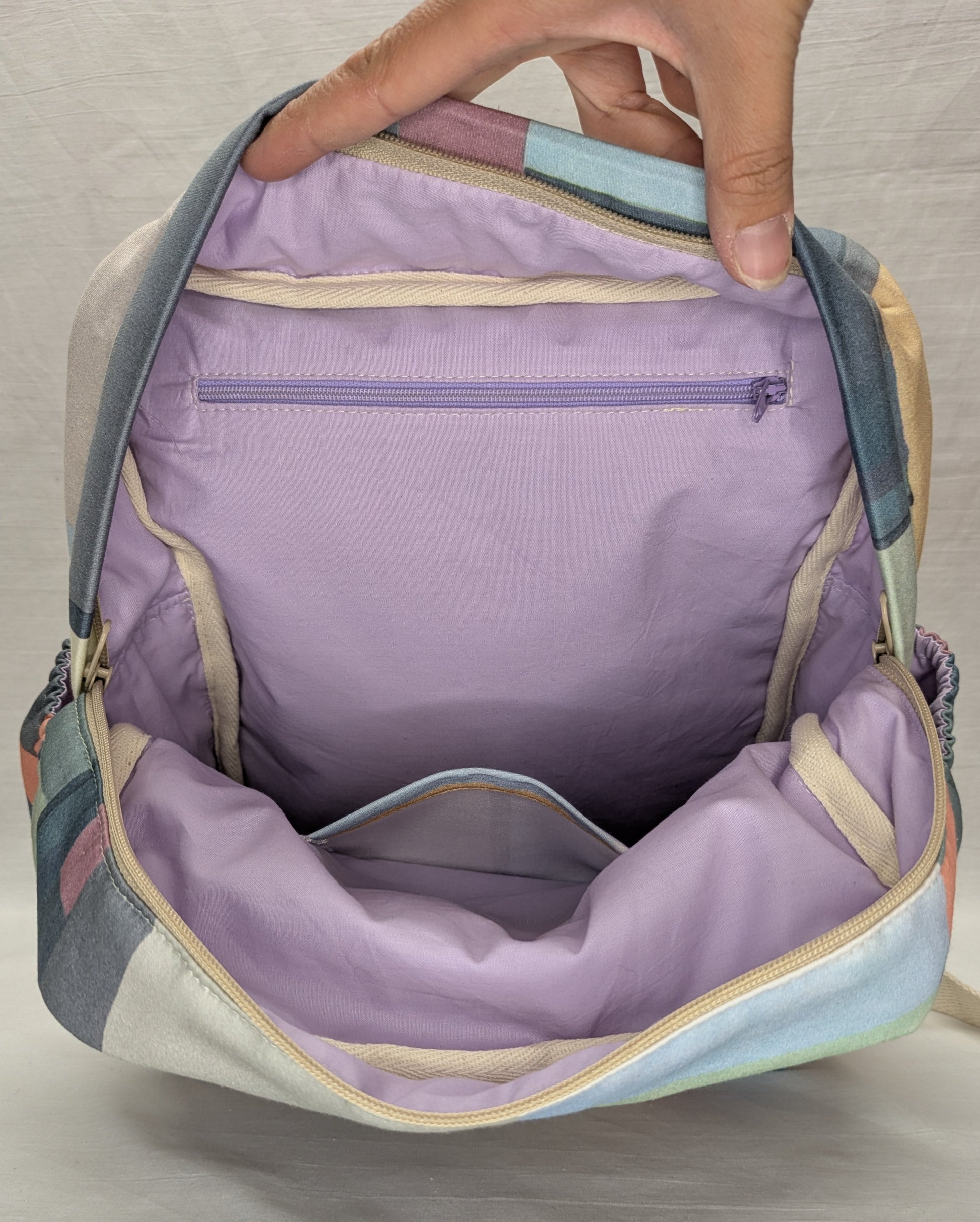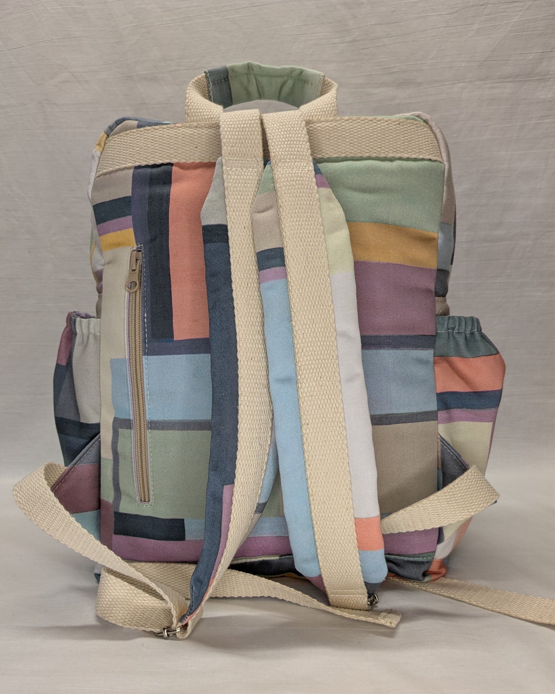 Handmade from remnant cotton fabrics, this backpack combines a bold geometric print with a vibrant purple lining for a stylish, sustainable carry-all. Every bag is carefully crafted, with attention to detail in every stitch, making it a truly one-of-a-kind piece. Perfect for day trips, work, festivals, or weekend adventures.
