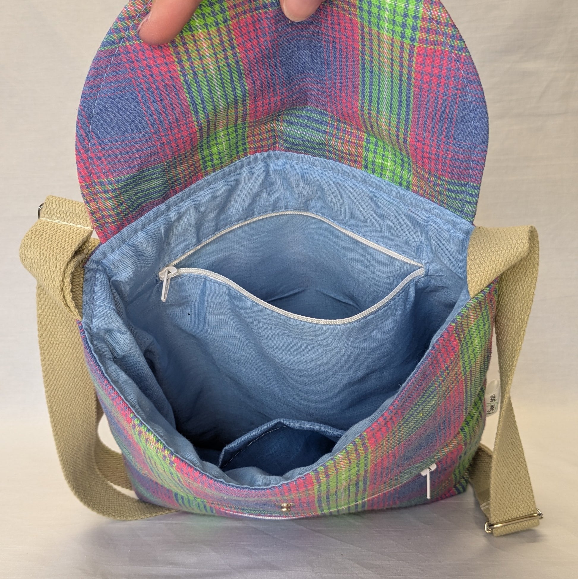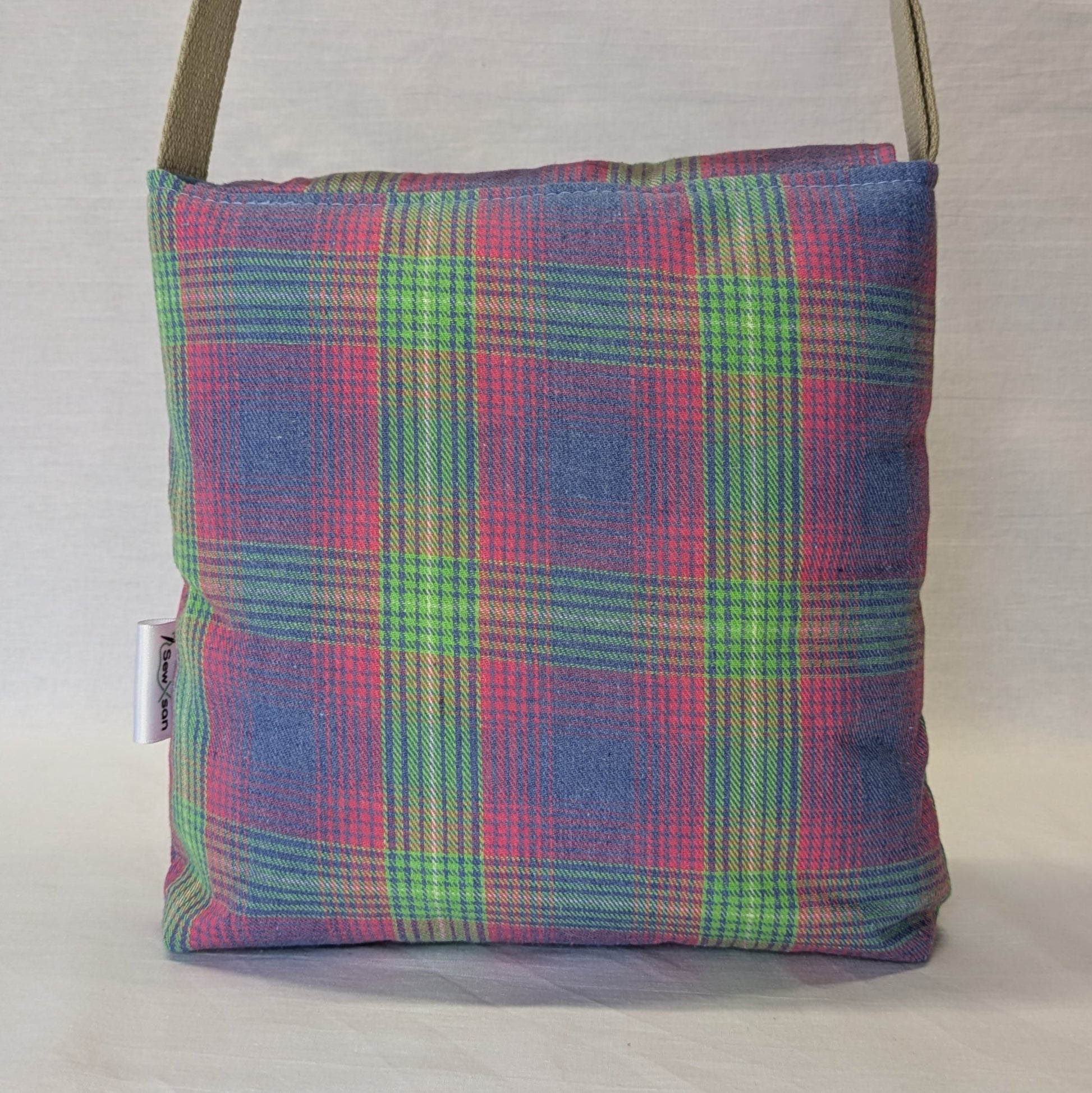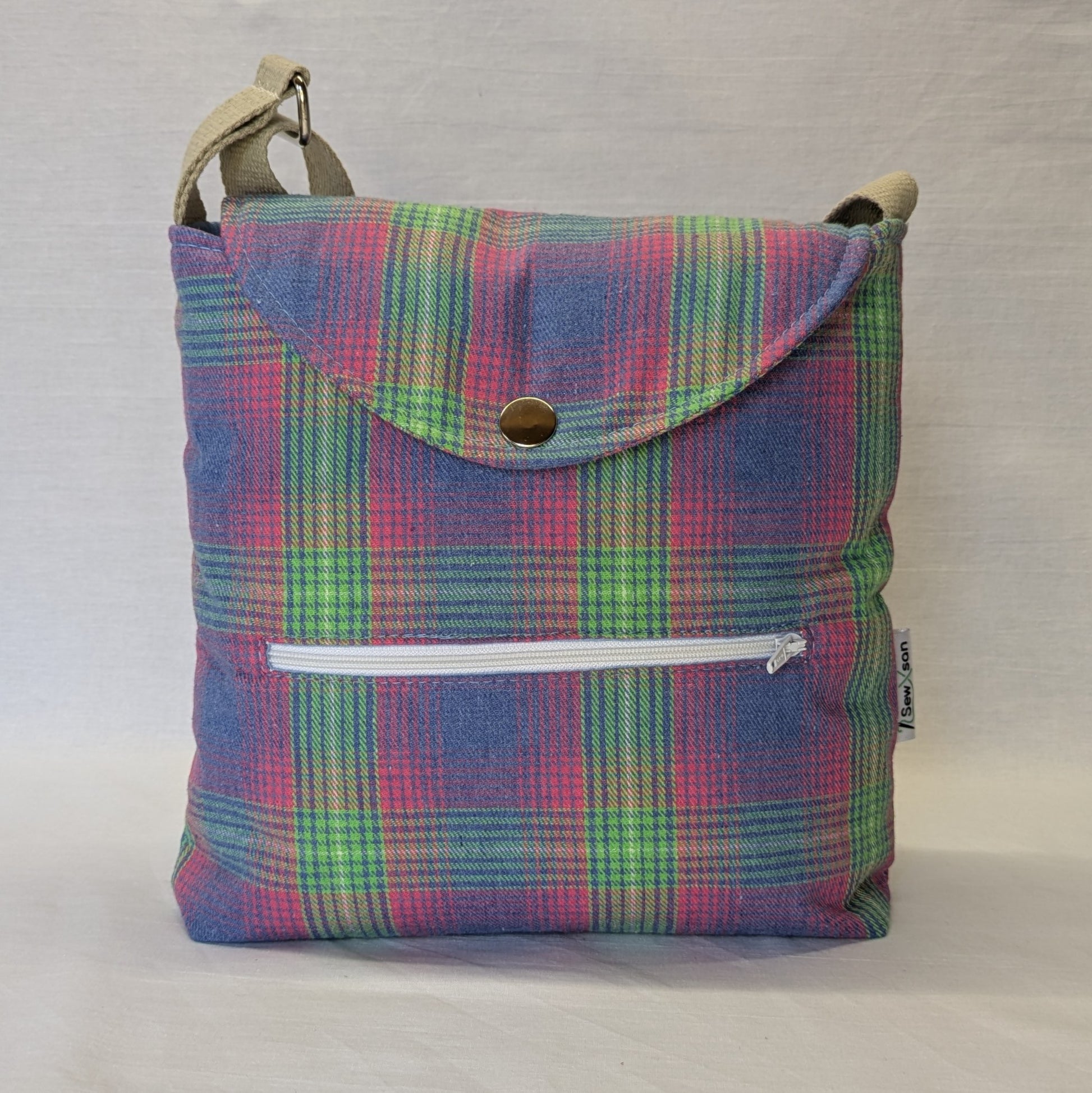 Add a playful pop of colour to your outfit with this vibrant tartan-style crossbody bag, lovingly handmade from recycled fabric. The cheerful pattern in shades of pink, green, and blue makes it a standout piece that’s both sustainable and stylish.