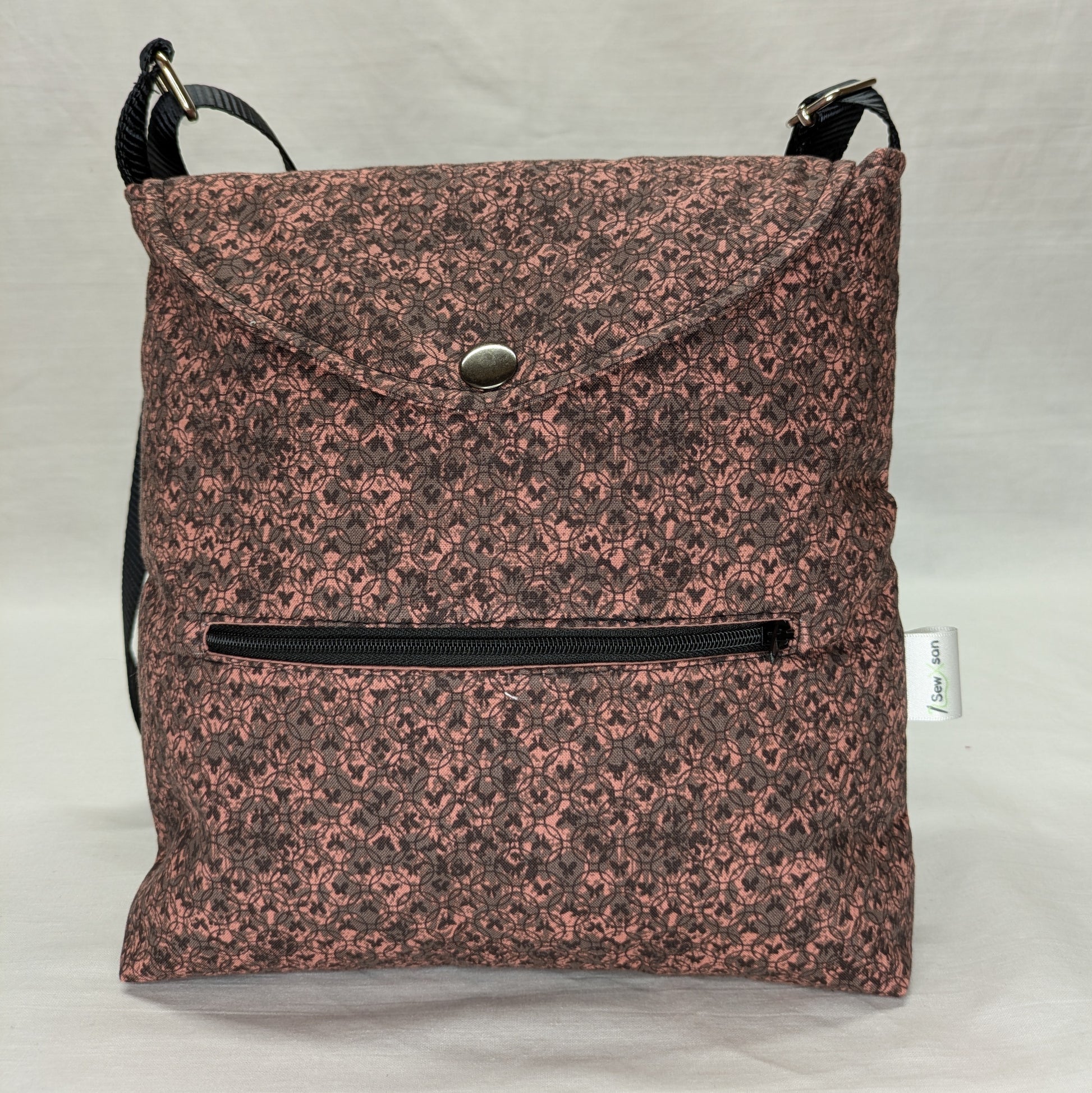 Crafted from recycled fabric, this crossbody bag is both practical and striking with its dark pink and black butterfly print. The pink lining gives it a bold finish, while the pockets inside and out keep everything organised.