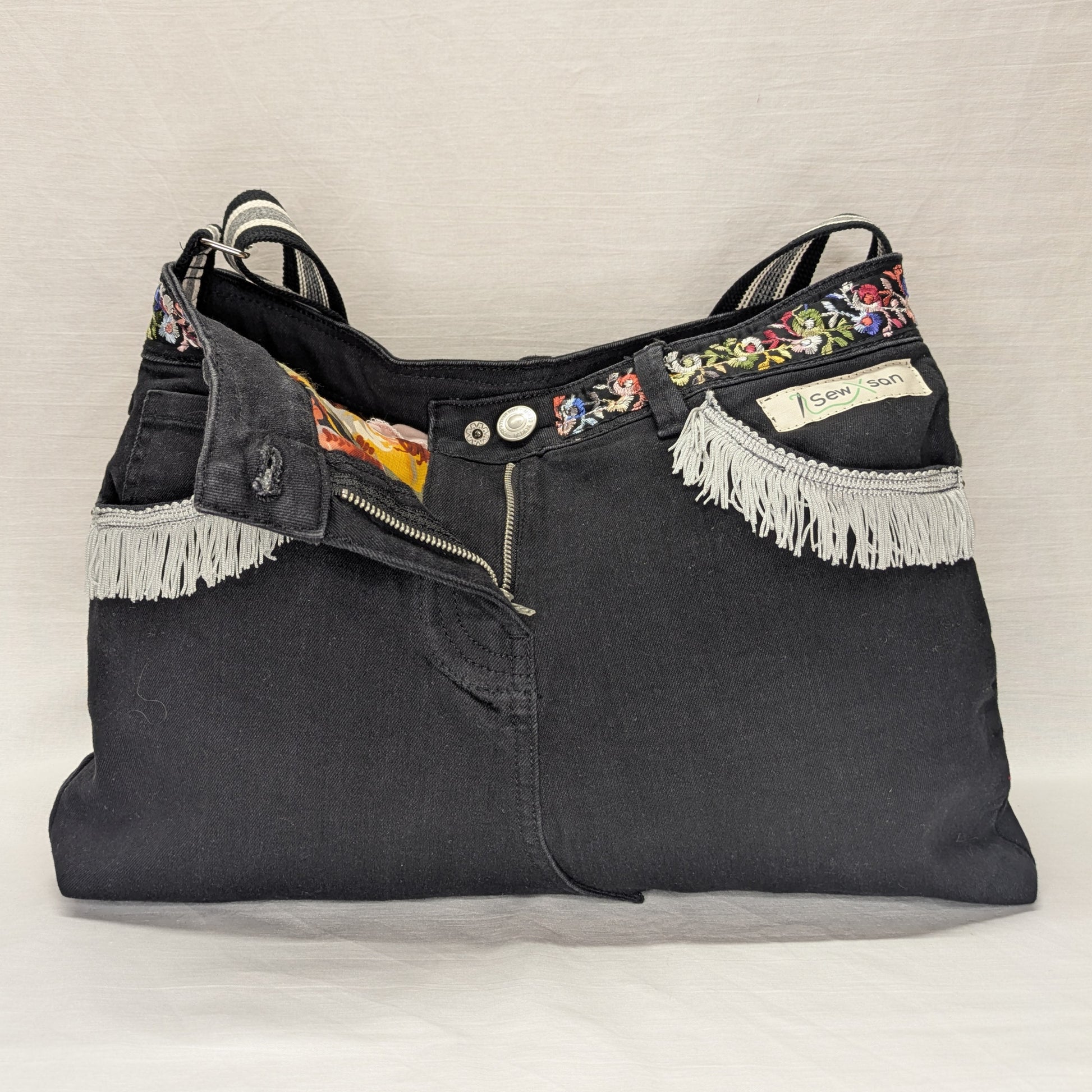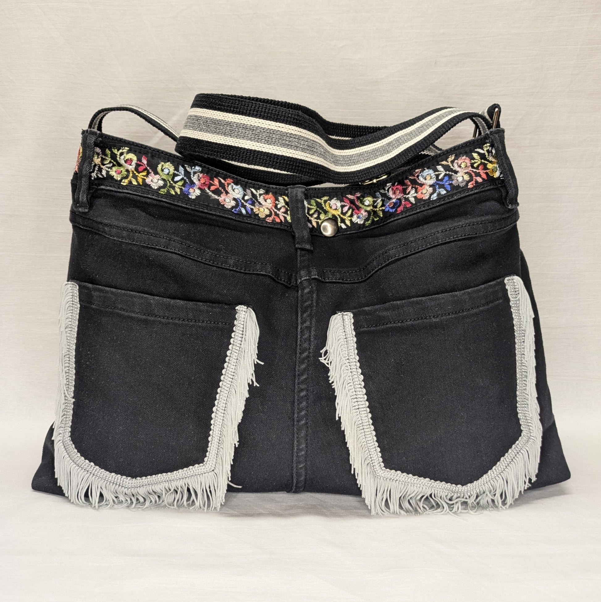 Bring the party everywhere you go with this one-of-a-kind crossbody made from upcycled black jeans! Packed with personality, it’s got swishy fringe, floral trim, and plenty of secret spots to stash your stuff.