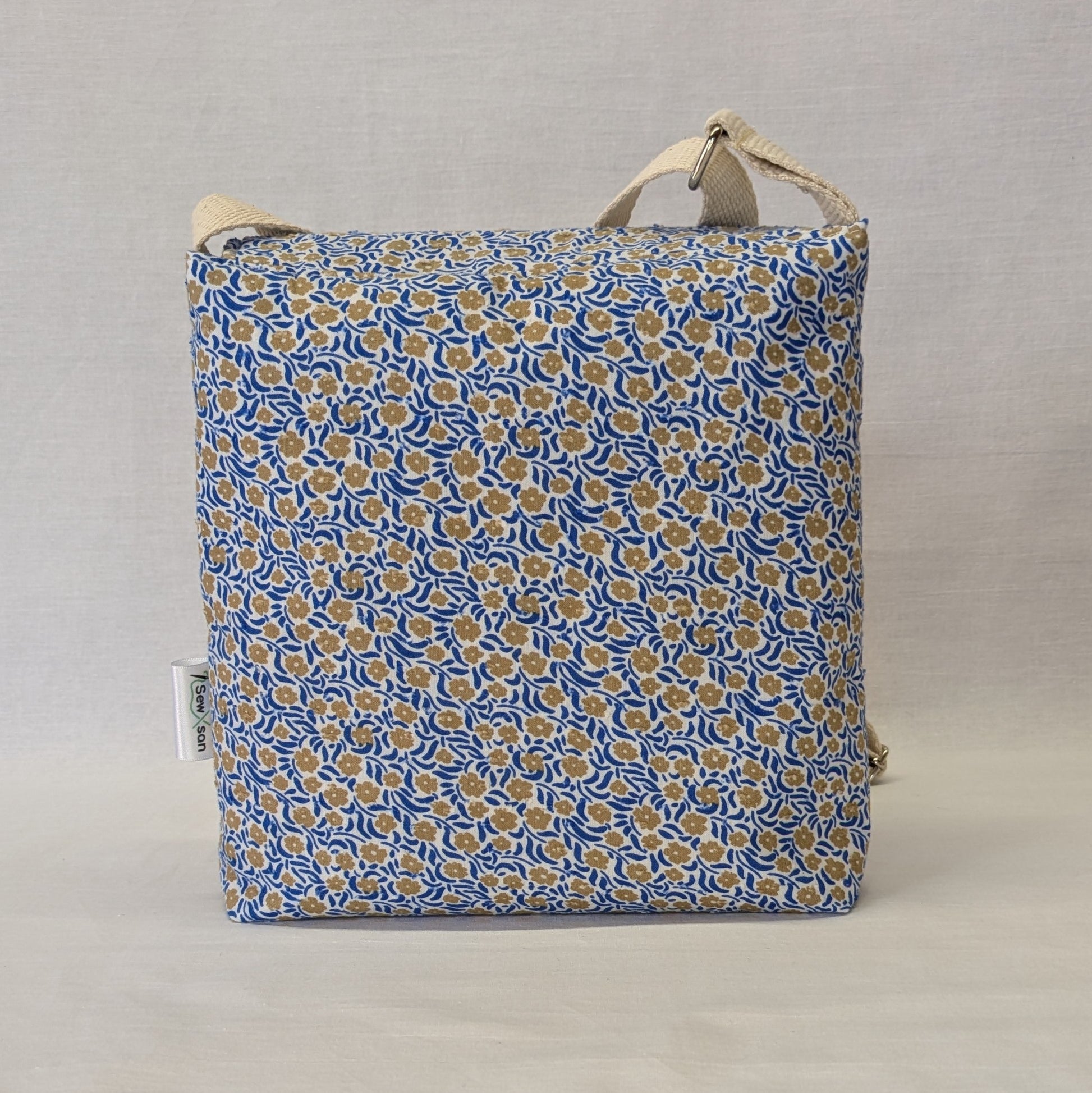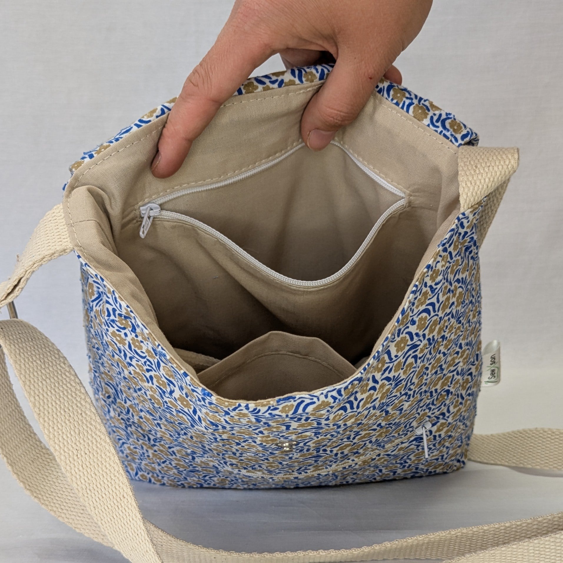 This stylish crossbody bag is made from recycled fabric featuring a delicate floral print in rich blue and warm beige tones. The small, detailed pattern gives it a classic charm, while the soft cream lining adds a clean, fresh finish inside.