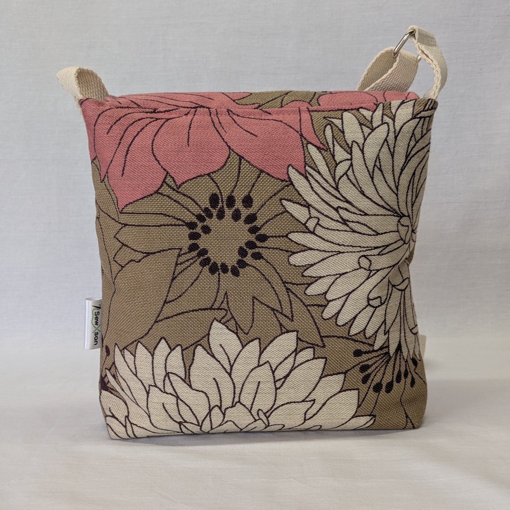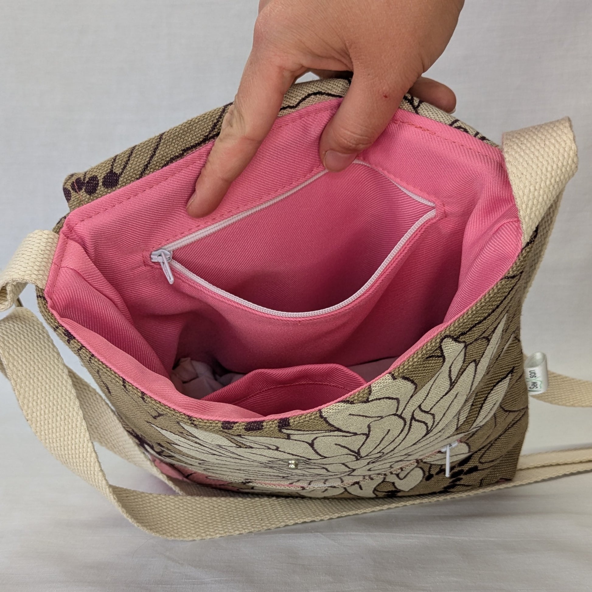 Elegant and timeless, this crossbody bag is crafted from a recycled jacquard weave fabric featuring soft floral tones in pinks and creams. The textured fabric adds a luxurious feel, while the floral pattern brings a romantic, vintage-inspired charm.